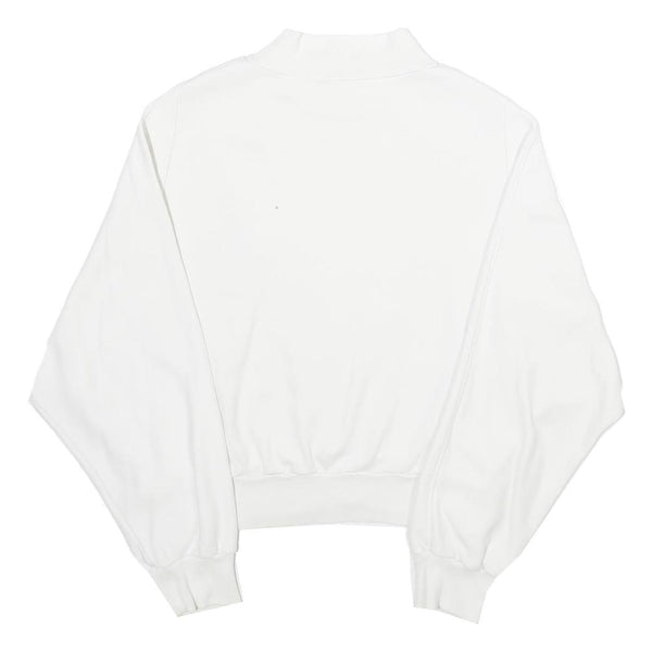 The pullover style has a crew neckline and long sleeves with fitted cuffs, creating a slightly cropped and relaxed fit. The back is plain white, ensuring versatile and easy styling options.