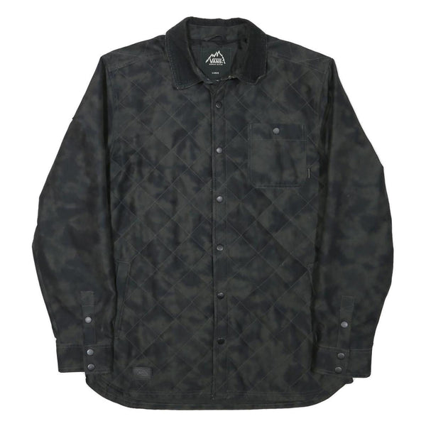 This VANS Mens jacket features a subtle black patterned quilted design with a button-up front closure. The jacket includes a chest pocket with a button flap and two side pockets, offering practical storage options. The collar is crafted in a corduroy-like texture that adds contrast and interest to the otherwise smooth outer fabric.