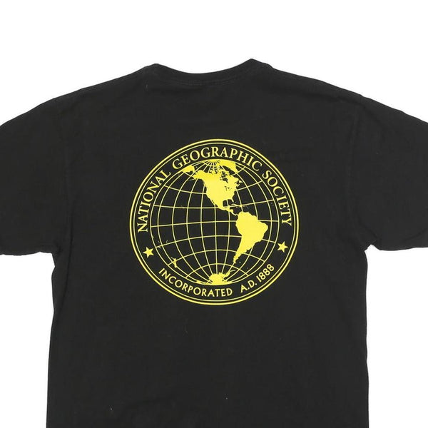 This VANS Mens T-shirt features a classic black base with a small chest logo that combines the VANS and National Geographic branding. The back is adorned with a large, circular yellow graphic representing the National Geographic Society, including a stylised globe and text.