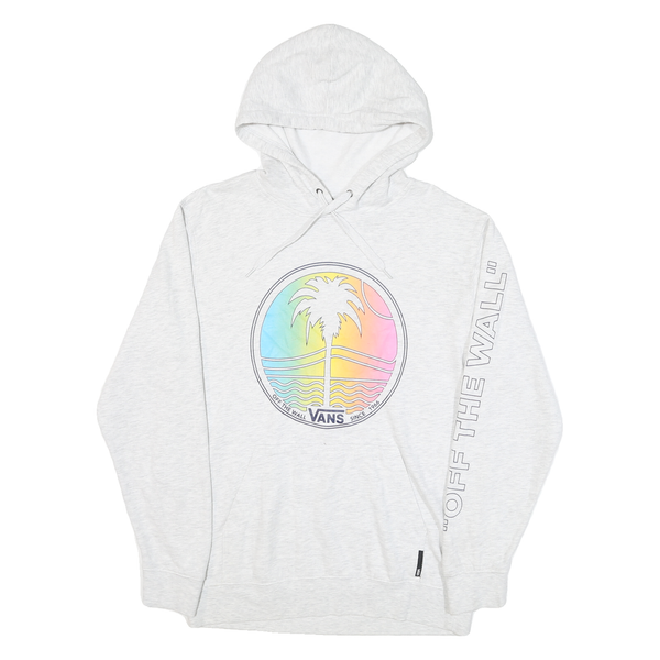 This Vans hoodie features a light white cotton blend fabric with a subtle heathered texture, offering both comfort and style. The front showcases a vibrant circular graphic with a palm tree against a rainbow gradient background, embodying a laid-back, beach-inspired aesthetic. The right sleeve is adorned with the iconic "OFF THE WALL" text running vertically in matching tones.