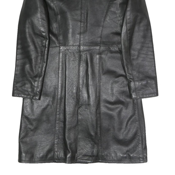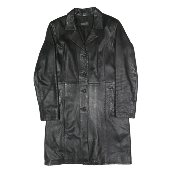 This Womens jacket by VERA PELLE features smooth black faux leather with a plain woven fabric finish, lending a sleek and timeless look. It has a classic point collar and button closure, paired with long sleeves for full coverage.
