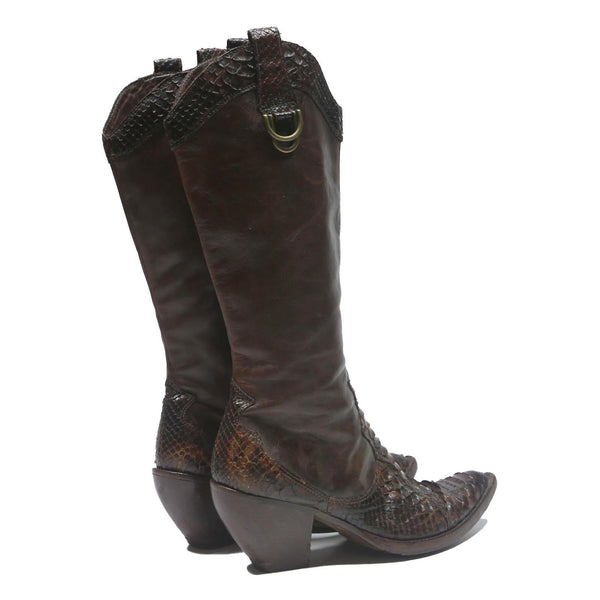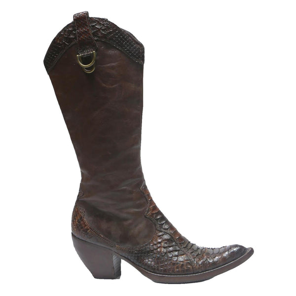These VERO CUOIO womens boots feature a rich brown leather construction with a Western-inspired design. The boots combine smooth leather sections with textured, scale-like leather detailing on the toe, heel, and top edge, offering a striking contrast and distinctive style. A small strap with a metal buckle detail is present at the top for added visual interest.