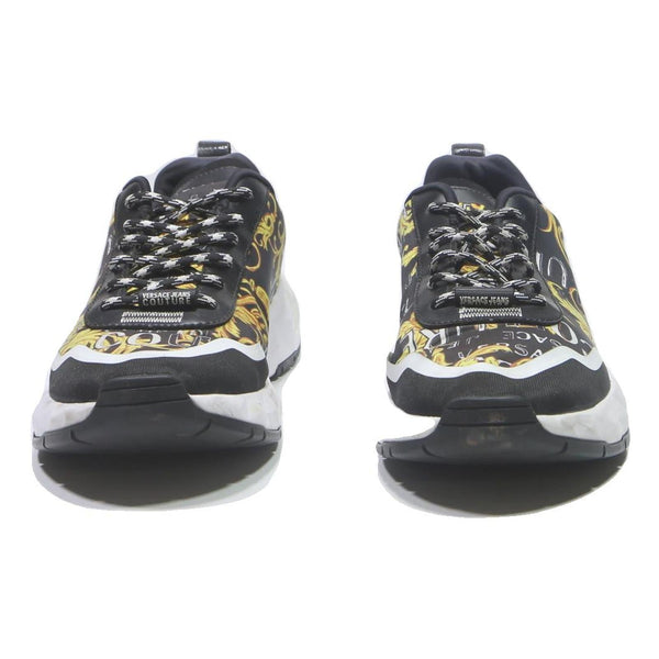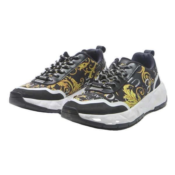 These Versace Jeans Couture mens trainers are a standout piece in black synthetic material with bold gold baroque print and large may include visible logo text throughout. The lace-up design features patterned black and white laces and a cushioned tongue, providing a sporty yet fashionable look.