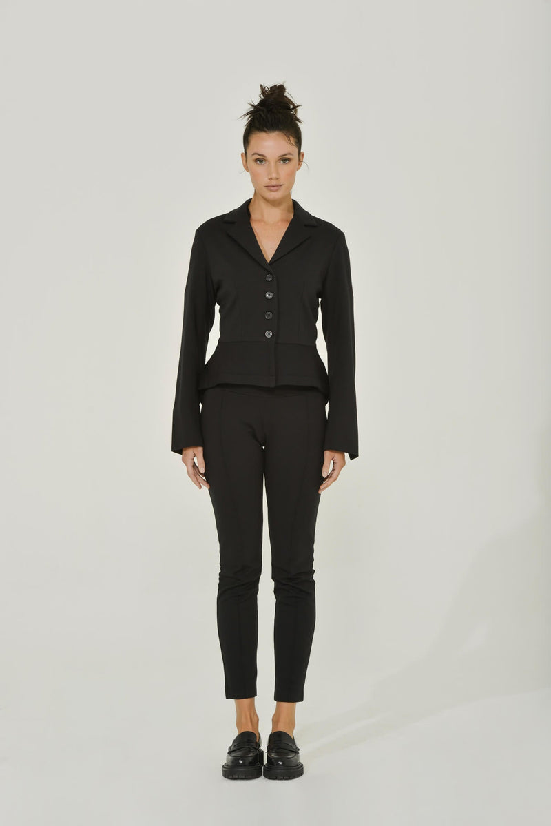 If you are looking for a feminine power jacket, then look no further. Our vintage-inspired jet-black women's jacket takes a note from the glamorous suits of the 50s. We combined it with our earth-friendly bamboo Ponti De Roma mix fabric to create a modernized earth-friendly version of a flattering, tailored, peplum-style jacket with distinctive style.
