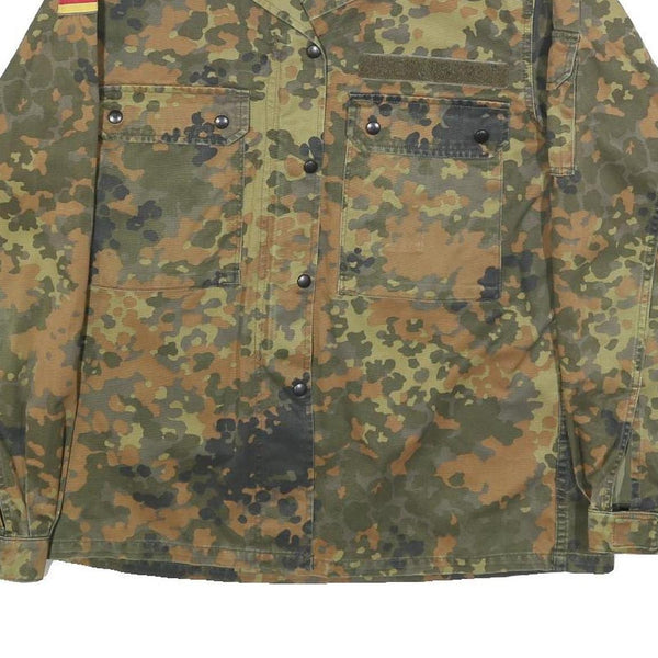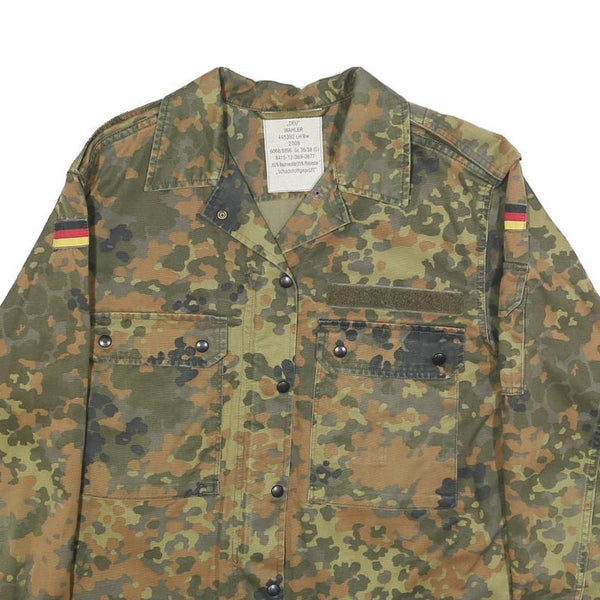 This Wahler womens jacket features a distinctive green and brown camouflage print, ideal for an outdoor or military-inspired look. The shirt-style collar and snap button details add functional style, while the camouflage pattern covers the entire garment. Small German flag patches are visible on the sleeves, offering subtle detailing without overt team branding.