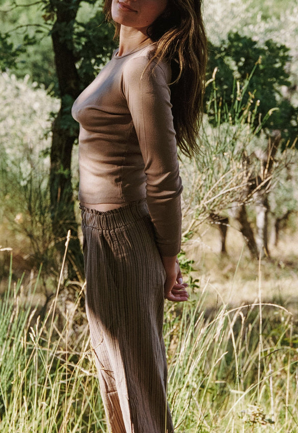 Our favorite everyday pant with flavor. Medium weight linen trouser featuring an elasticized waist band and hip pockets. Ankle length with a wide hem. Inseam is ~30".