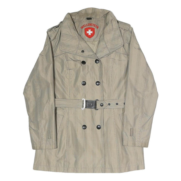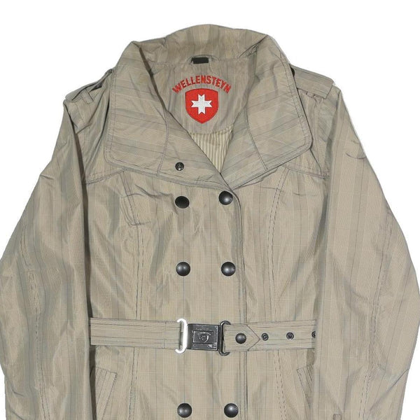 This womens jacket by WELLENSTEYN features a beige colour with a subtle striped pattern giving it a classic yet modern appearance. The jacket bears a double-breasted button closure with a waist belt and buckle detail, enhancing the fit and adding style. The collar is broad and structured, complementing its tailored aesthetic.
