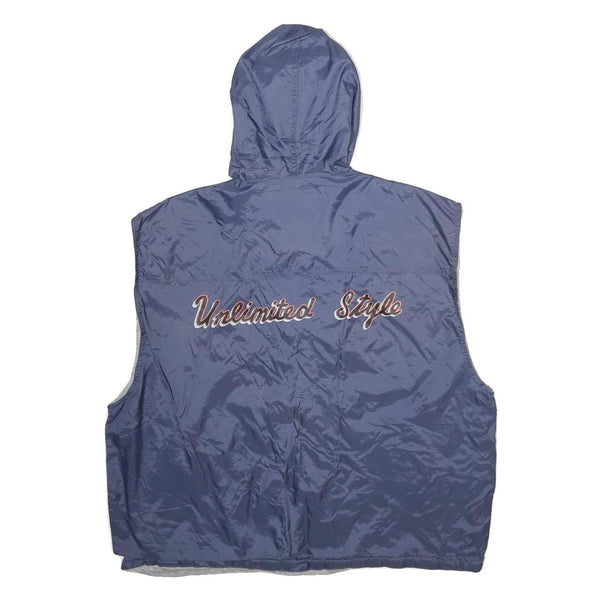 This mens West Coast jacket features a deep blue nylon shell with a lightweight, slightly shiny finish. It has a hood with drawstrings and a button-up front closure. The sleeveless design is unique, blending the appeal of a vest and jacket with a hood for added style. The front is embroidered with the word "Unlimited" in a sporty script, while the back carries "Unlimited Style" in matching embroidery.