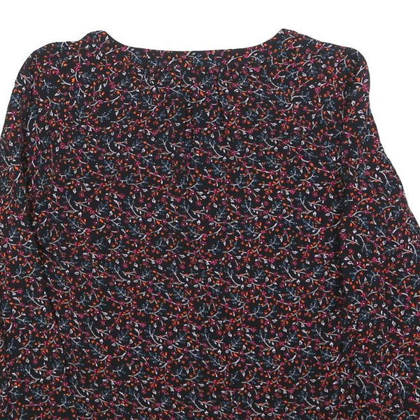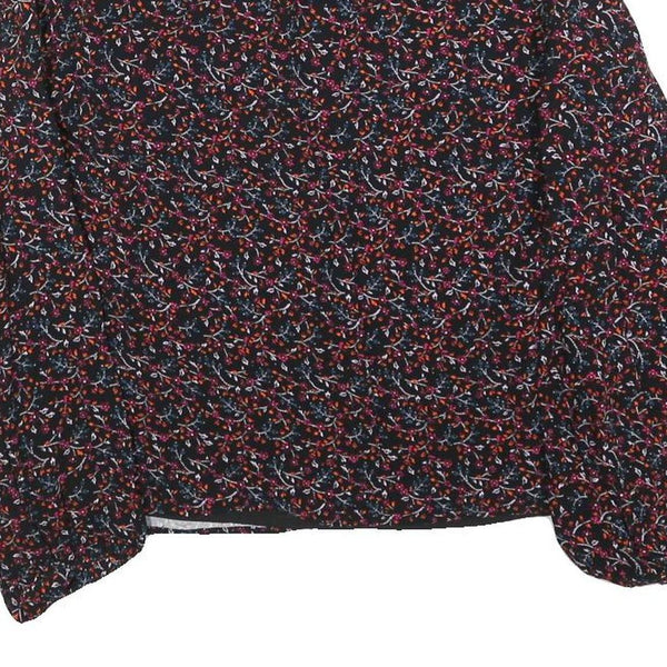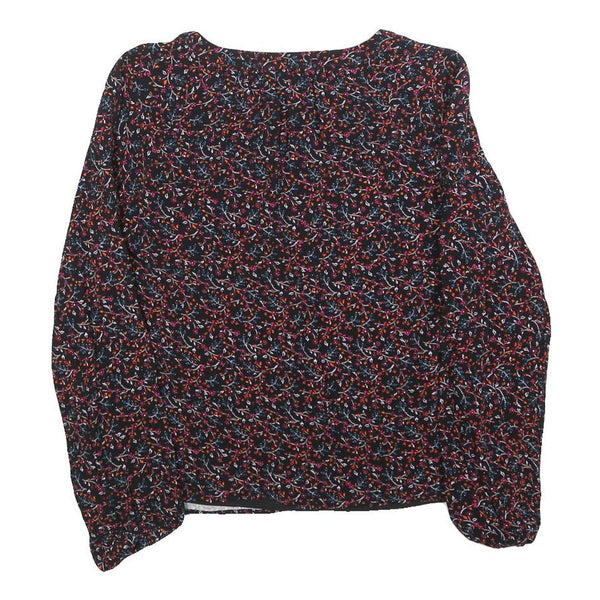 This WHISTLES womens top features a black base with a delicate floral print in red, pink, and blue tones creating a vibrant yet elegant look. The fabric has a subtle textured effect adding depth to the print. It features a flattering V-neckline and long sleeves gathered at the cuff for a softly billowed effect.