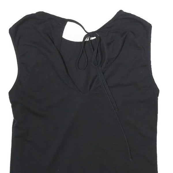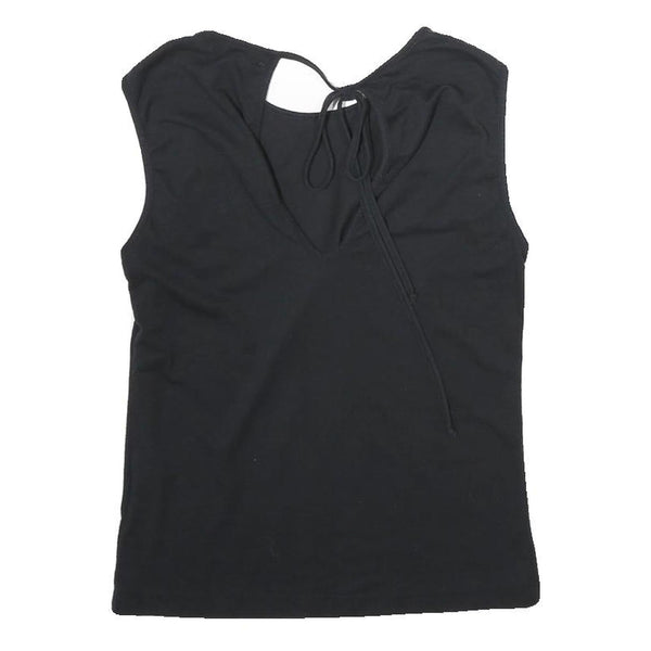 This sleek black sleeveless top from WHISTLES is crafted from soft cotton providing a comfortable and breathable wear. The front features a classic crew neckline while the back showcases a stylish V-neck with thin tie straps, adding a subtle element of elegance and interest.