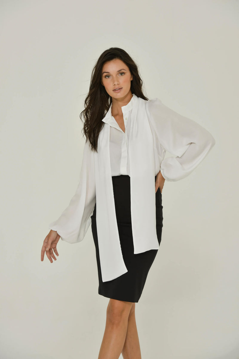White Long Sleeve Mandarin Blouse w/ Removable Bow