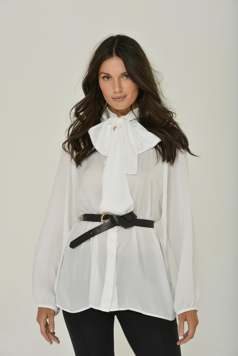 The optional bow that comes with the blouse allows for a multitude of styling options. The 72-inch pussy-bow elegantly slides through a discreet guiding loop (please keep in mind the loop is for bow alignment purposes and is not weight-bearing) on the back of the neck. It can be removed, worn as a pussy-bow, scarf, side knot, or untied for a masculine chic look. Wear this silky soft top tucked in jeans for casual comfort, or pair it with Intention's beloved ankle pants. One of our favorite looks, pictured in images, is this blouse untucked and cinched with a vintage belt. Devine.