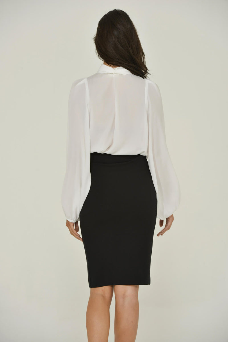 Find endless uses for this stunning long sleeve white, French Chiffon, mandarin collar blouse, with an optional bow that allows endless styling options. Move from casual to glam in a snap by adding or removing the blouse's bow, which comes with an elegant button placket. Made in the USA from imported Eco-French Chiffon, achieved through a proprietary blend of 50% Recycled Polyester and 50% Polyester recycled from PET Bottles for a silk-like look and feel. It's eco-friendly, passed the Global Recycle Standard (GRS), and is OEKO-TEX® Standard 100 certified.