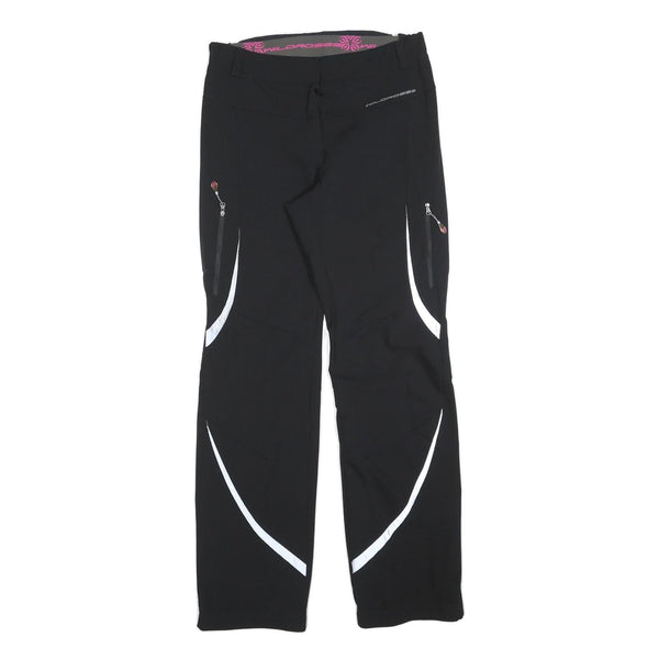 These WILDROSES womens trousers feature a sleek black colour with reflective white curved stripes for enhanced visibility. The subtle WILDROSES branding appears on the waistband adding a touch of style. Designed with practical zipped pockets on the thighs for secure storage, the trousers combine sporty elements with everyday functionality.