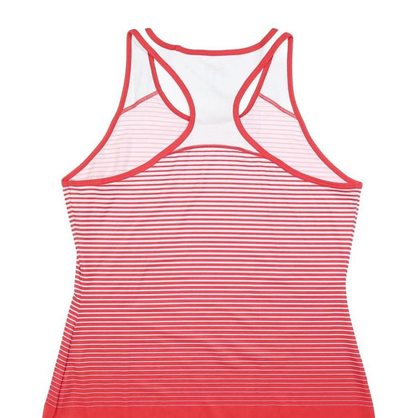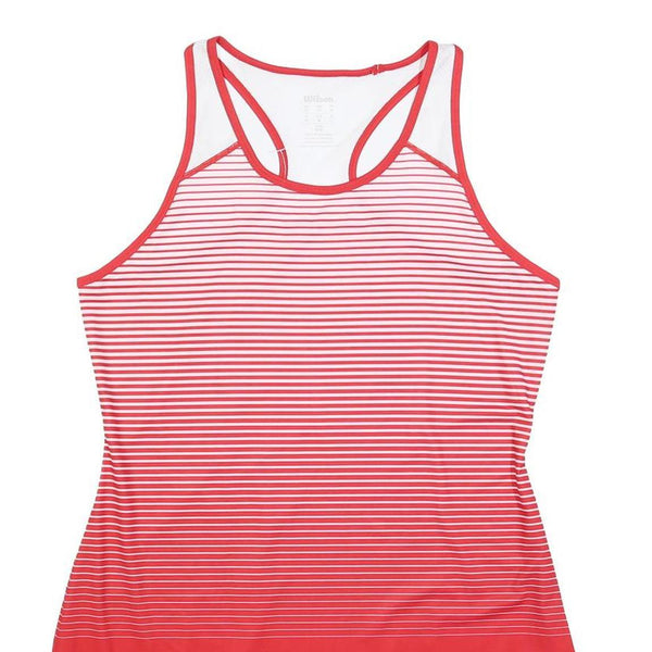 This Wilson womens dress features a stylish red and white horizontal striped pattern that fades into a solid red at the hem. It has a sleeveless racerback design with red trim along the neckline and armholes, giving it a sporty and breathable look. The small Wilson "W" logo is embroidered near the hem on the front left side.