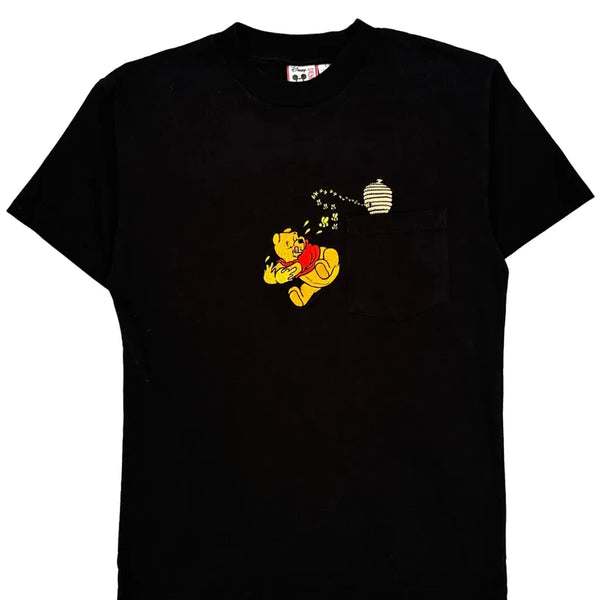 Black T-Shirt With Winnie The Pooh Graphic On The Front Pocket.