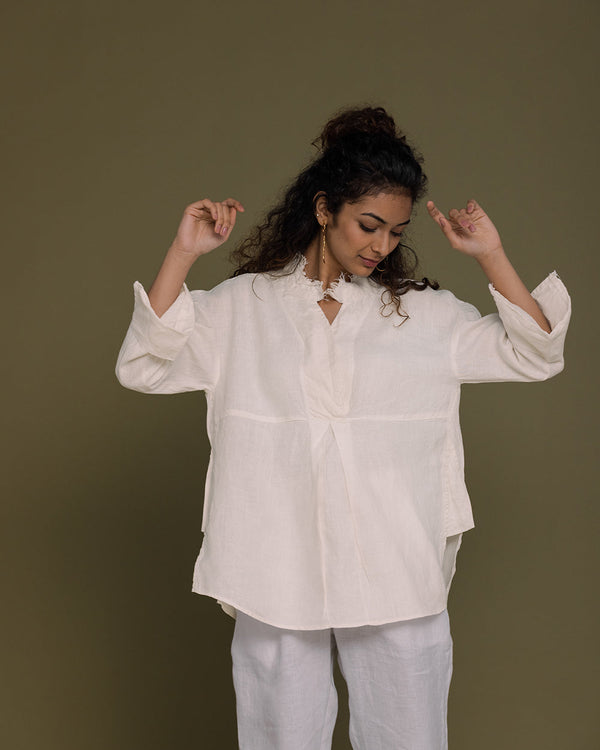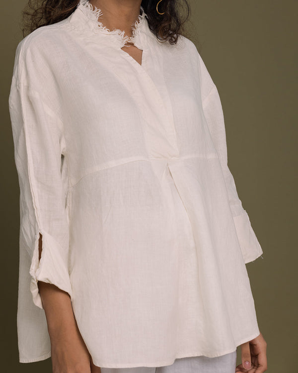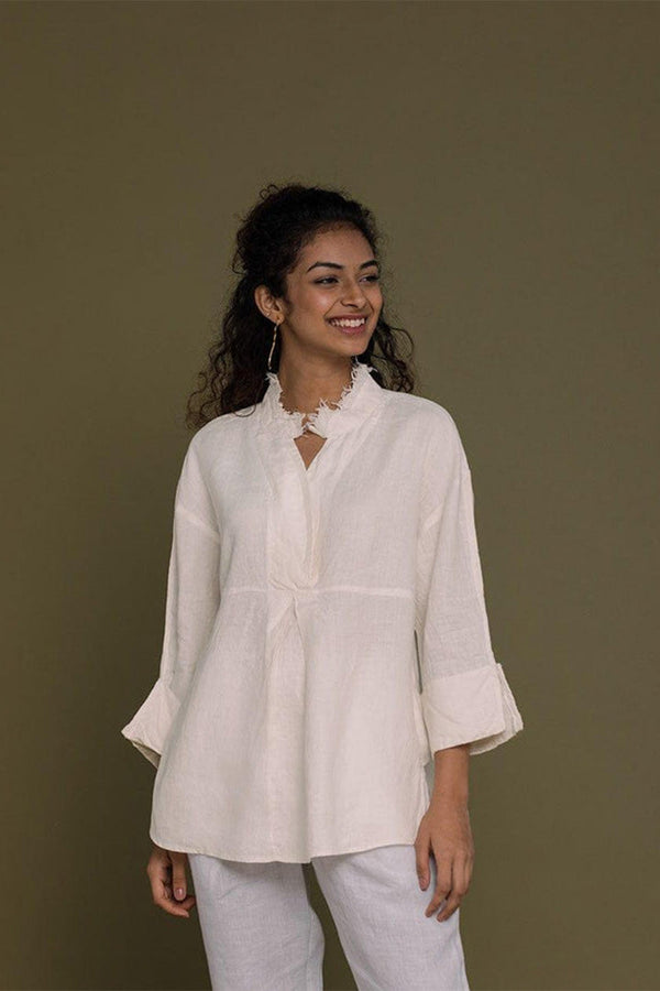 Elevate your style with this shabby chic top that accentuates all body types with casual box pleats in the front and an edgy frayed neckline.