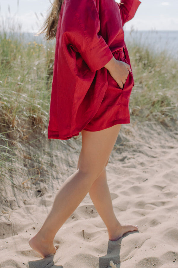 The red linen fabric shorts women are crafted from high-quality deadstock linen fabric. This women linen set can be machine-washed with similar colours at 30°C/86°F and ironed or steamed on low heat. Lightweight linen set women is made for eco-conscious women.