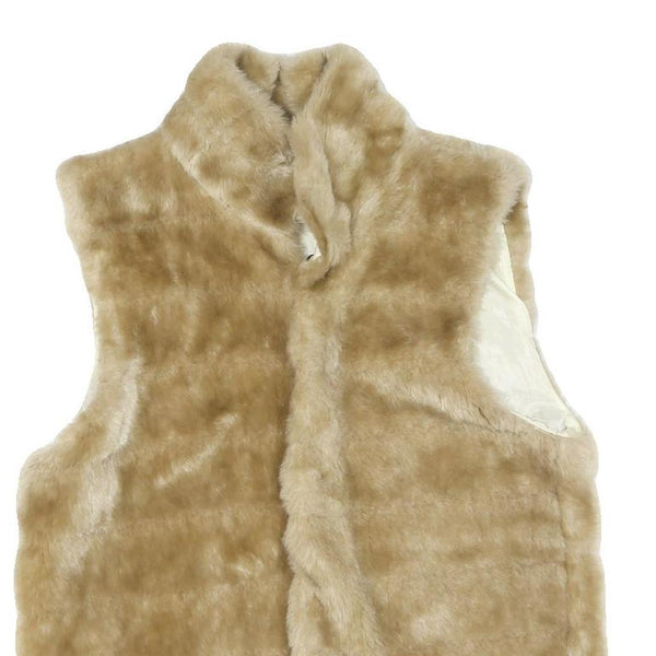 This womens jacket features a plush beige faux fur exterior that exudes softness and cosy warmth. The design is sleeveless with a stand-up collar for a chic look, and it fastens with buttons down the front for easy wear.