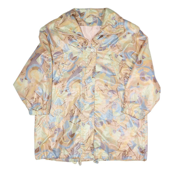 This womens jacket features a soft beige base colour with an abstract geometric pattern in muted blue, brown, and peach shades, creating an artistic and retro-inspired appearance. It is equipped with a full zip closure concealed by a button placket for added style and protection. The jacket has a stand-up collar and long sleeves with elasticated cuffs for a secure fit.
