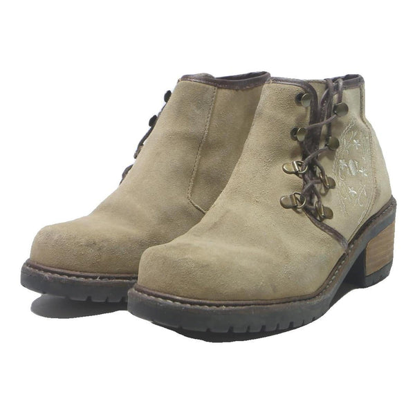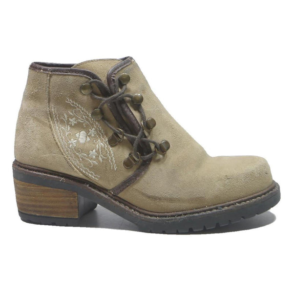 These womens ankle boots feature a beige leather upper with a soft suede finish. Decorative embroidery adorns the sides, adding a vintage-inspired floral touch. The boots have a lace-up front with metal eyelets and a rugged, treaded sole for durability.