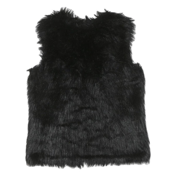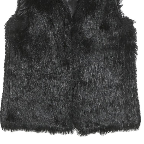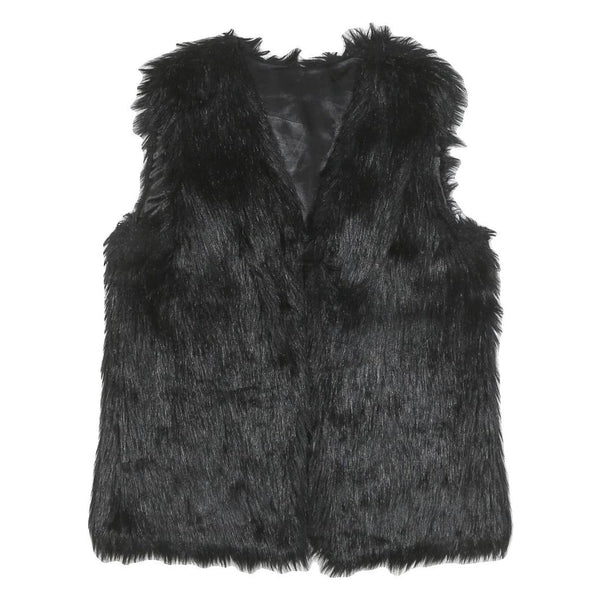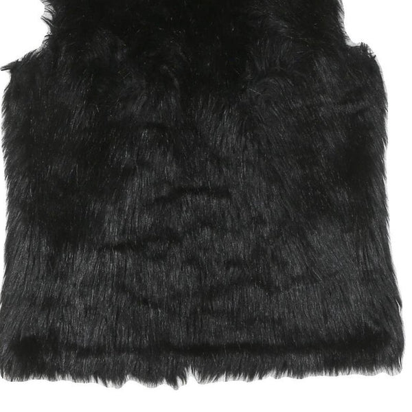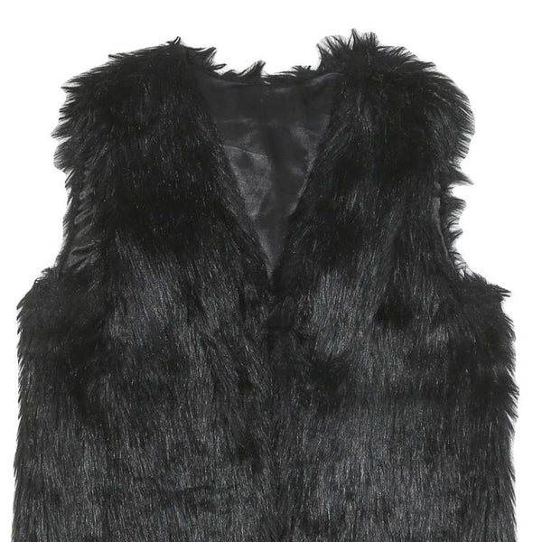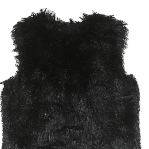 This womens jacket is crafted from a polyester blend featuring a rich black faux fur finish that offers a luxuriously soft and warm feel. The sleeveless design makes it perfect for layering over various outfits, adding a stylish touch with its plush texture.