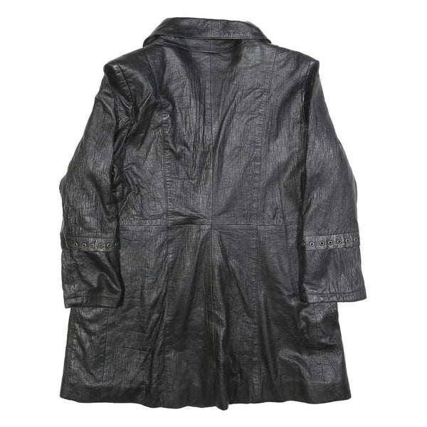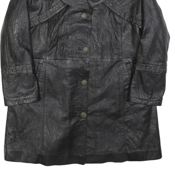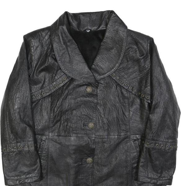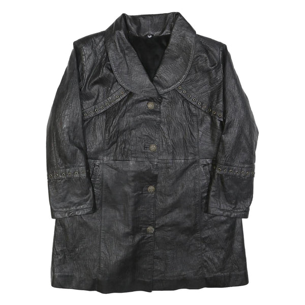 Womens Black Leather Button Jacket M Plain Classic Stylish Eyelet Detail
