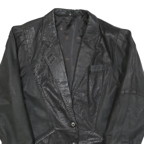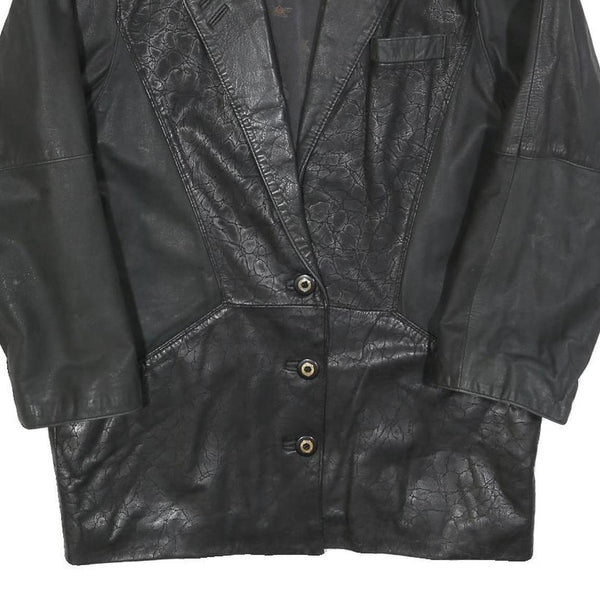 This womens jacket features a deep black leather composition that blends two leather textures to create contrast and visual interest. The front has a button closure and a classic collar, with a subtle seam design enhancing the structure. The jacket has a woven fabric type with smooth leather sleeves and a textured leather body.