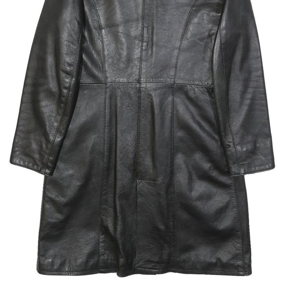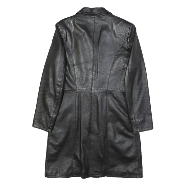 This womens jacket features a sleek black leather exterior with a classic tailored fit, button closure, and notch collar. The coat length offers coverage ideal for both casual and formal wear while providing a timeless silhouette.