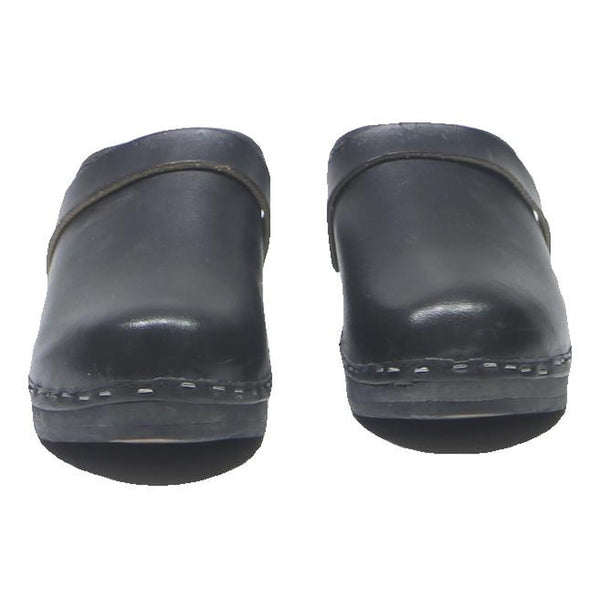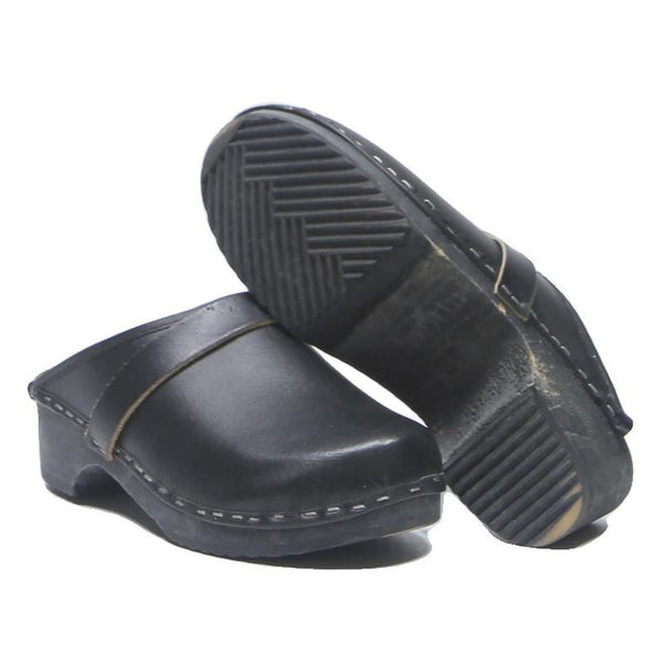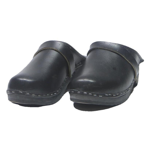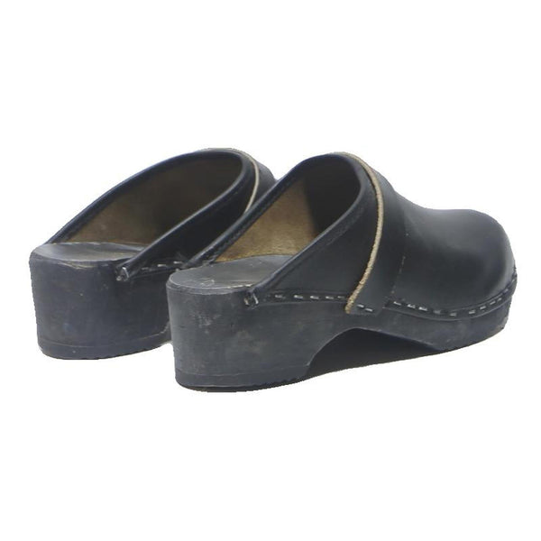 These womens shoes are slip-on clogs crafted from smooth black leather for a sleek and durable finish. The shoes feature clean lines with visible stitching around the base, connecting the leather upper to a sturdy sole with a small block heel.