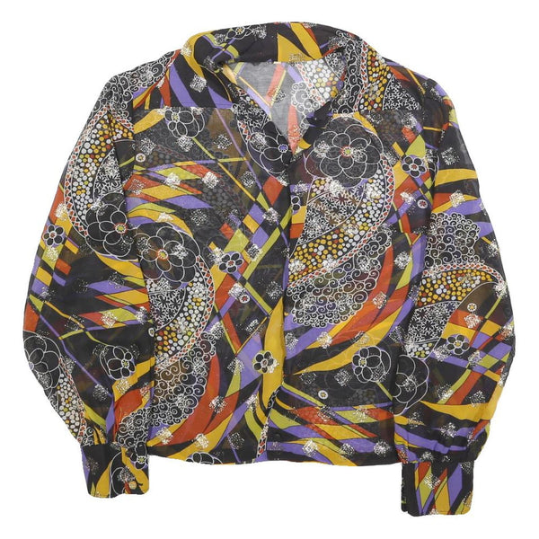 This womens top features a vibrant and intricate pattern with colours including black, yellow, purple, red, and white. The print combines geometric and floral motifs, creating a lively and eye-catching look. The top has a classic collared neckline and long sleeves with wide cuffs for a comfortable fit.