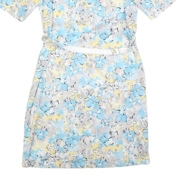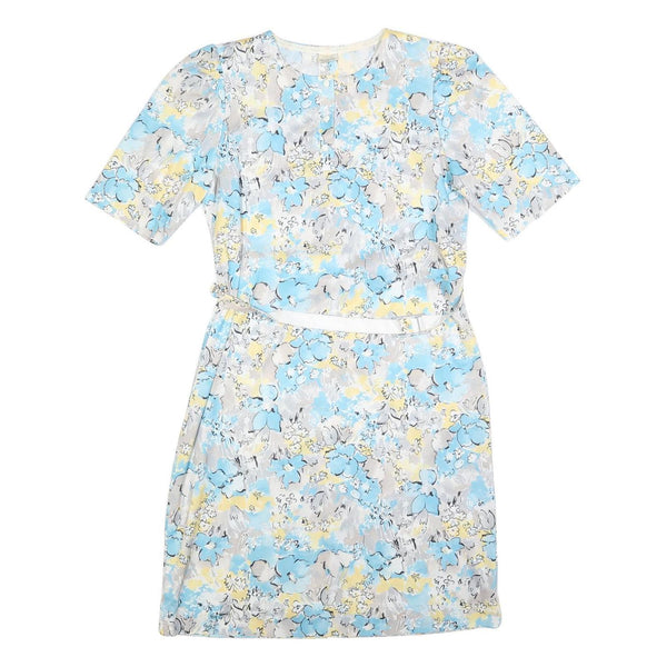 This womens dress features a soft floral pattern in shades of blue, cream, and yellow with subtle grey accents, creating a fresh and delicate look. It has short sleeves and a round neckline, with a narrow belt detail to cinch the waist and enhance the silhouette. The dress falls above the knee for a flattering and easy-to-wear length.
