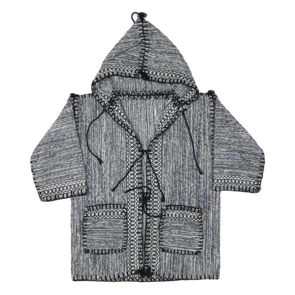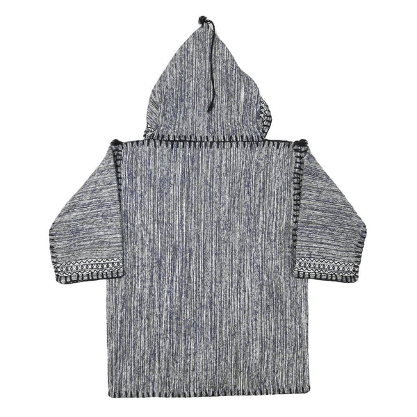 This womens jacket features a blue and white tonal palette with a plain vertical woven pattern throughout. It has an attached hood with a pointed top and black drawstrings at the front for adjustable fastening. Decorative stitched trimming in black and white borders the hood, front opening, cuffs and front patch pockets, adding artisanal charm to the garment.
