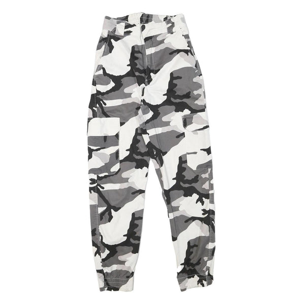 These womens cargo trousers feature a bold camo print in shades of black, grey, and white creating a striking monochrome pattern. Made from a cotton blend fabric, they offer comfort, breathability, and durability with a soft yet structured feel.