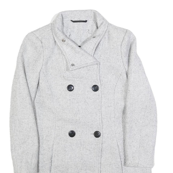 This womens jacket presents a soft grey colour with a subtle woven texture, featuring a double-breasted front accented by black buttons. It has a high collar that can be fastened for added warmth and a tailored fit that contours elegantly to the body. The jacket extends to the hip, providing a classic silhouette.