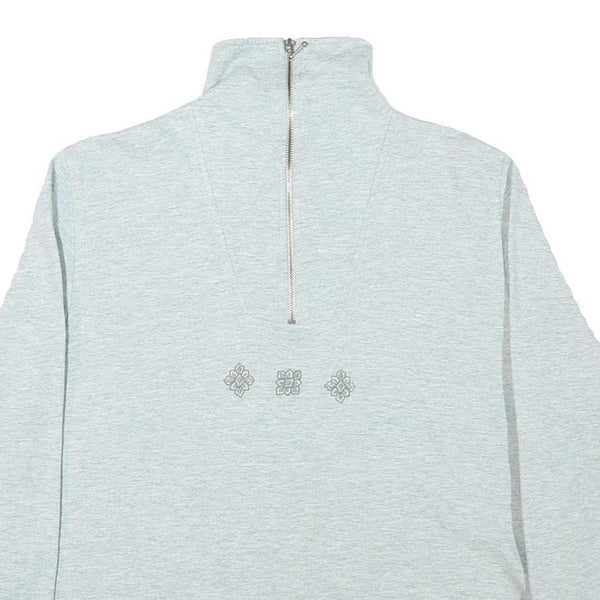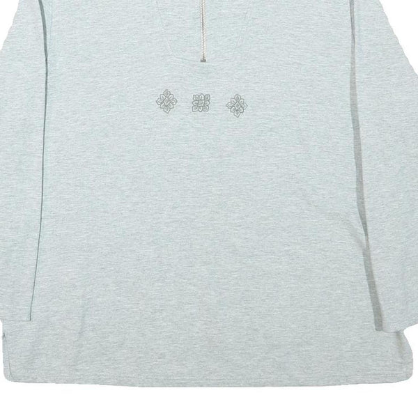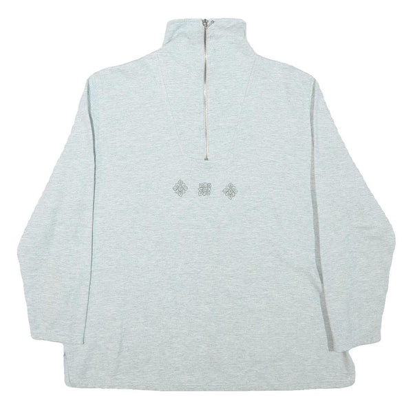 This womens sweatshirt is crafted from a comfortable cotton blend fabric in a soft grey colour. It features a high neck with a quarter zip closure, providing a snug fit and easy wear. The front showcases a subtle embroidered design with three geometric motif accents.