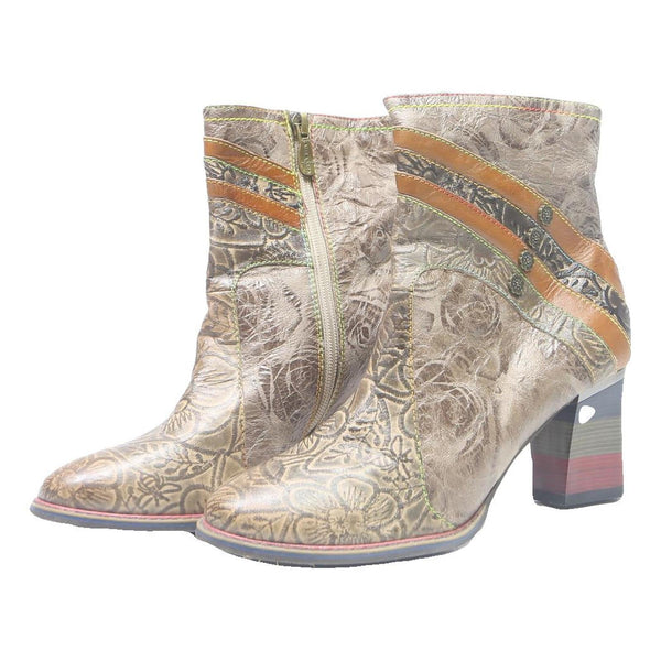 These womens ankle boots feature a unique beige leather exterior with intricate floral patterns embossed throughout the surface. Accented with brown leather stripes and decorative metal flower studs, the design offers an artistic and individual touch. The boots sport a medium block heel with a distinctive layered colour detail in shades of blue, green, yellow, and red, adding a pop of colour to the overall look.