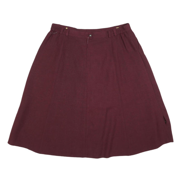 This womens skirt is crafted from a comfortable linen blend fabric in a rich maroon colour. It features a classic A-line silhouette with a button-front closure running down the centre. The skirt is adorned with subtle floral embroidery in shades of blue and white on the front panels, adding a delicate, feminine touch.