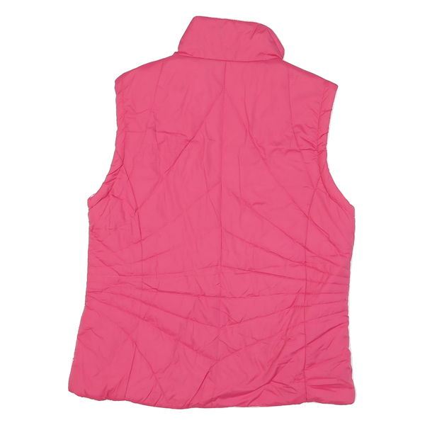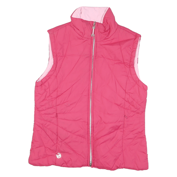 This womens sleeveless jacket features a vibrant pink colour on the outer side with a pale pink interior, showcasing its reversible design for versatile styling. The jacket has a high collar and a full zip closure, providing added warmth and adjustable coverage.