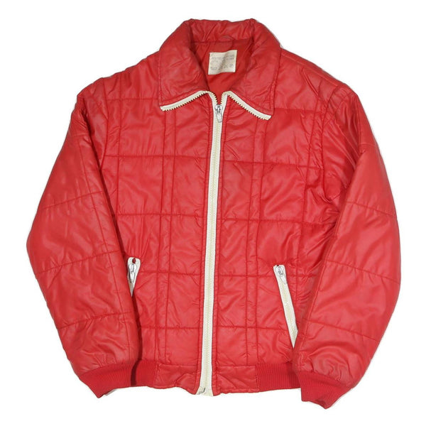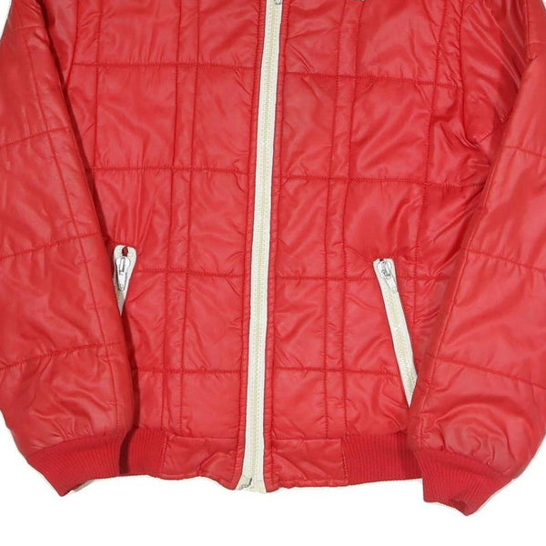 This womens jacket features a striking solid red colour with a neat plain pattern throughout. It has a full zip closure in contrasting white, complemented by matching zipped pocket details. The jacket is lightweight with a quilted texture, finished with ribbed cuffs and waistband for a comfortable fit and classic sporty look.