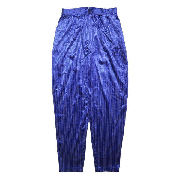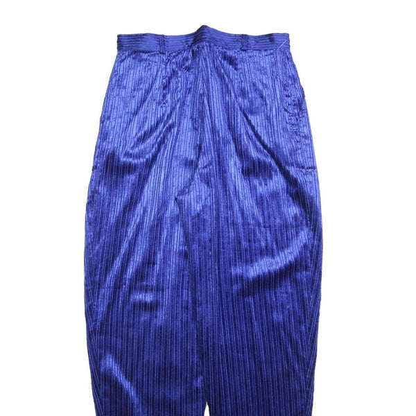 These womens trousers feature a striking deep blue colour with a subtle vertical stripe pattern throughout. They have a zip closure with additional button fastening at the waistband, providing a secure and comfortable fit. The material is a cotton blend, offering a soft, smooth feel with slight sheen and excellent breathability.