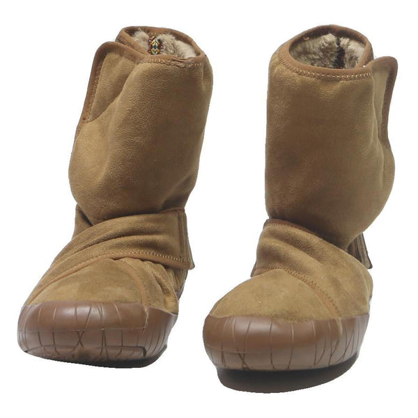 These womens ankle boots feature a soft brown synthetic upper with a smooth, suede-like texture. The boots boast an easy wrap-around fold design secured with a wide strap, adding both style and functionality. The brown sole extends up to protect the toe and heel areas, offering durable wear.