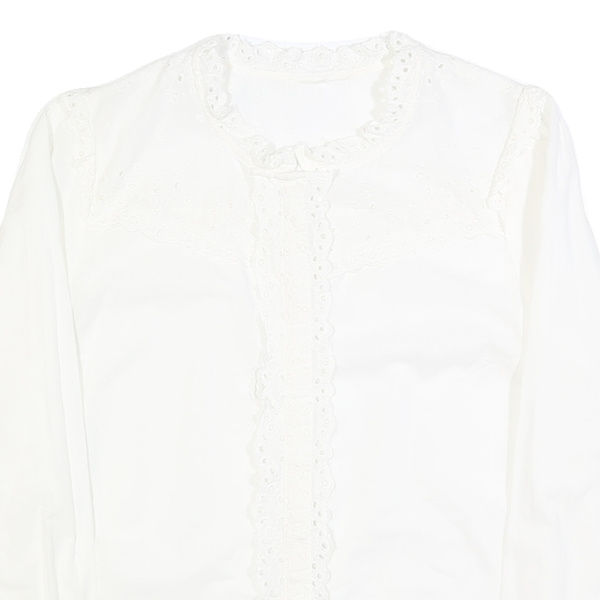 Womens white cotton blend blouse long sleeve round neck embroidered m lace trim