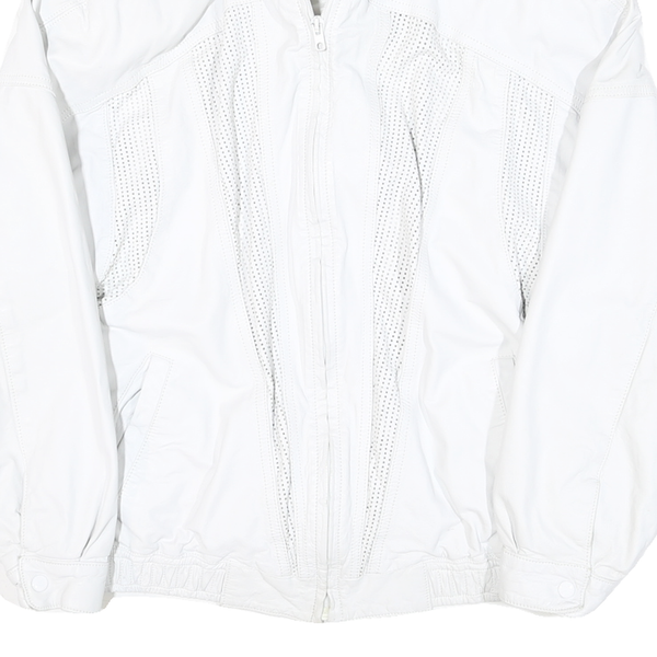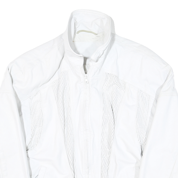 This women's jacket features a clean white leather construction with a subtle perforated detailing on the front panels and under the arms for added breathability and style. It has a stand-up collar and a full zip closure at the front, offering a sleek and modern look.