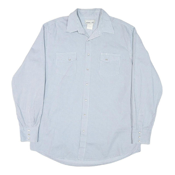 This Wrangler mens shirt features a subtle blue print throughout, presenting a clean and classic appearance. It has two chest pockets with button closures and pearl-like snap buttons running down the front placket, emphasizing its casual style.