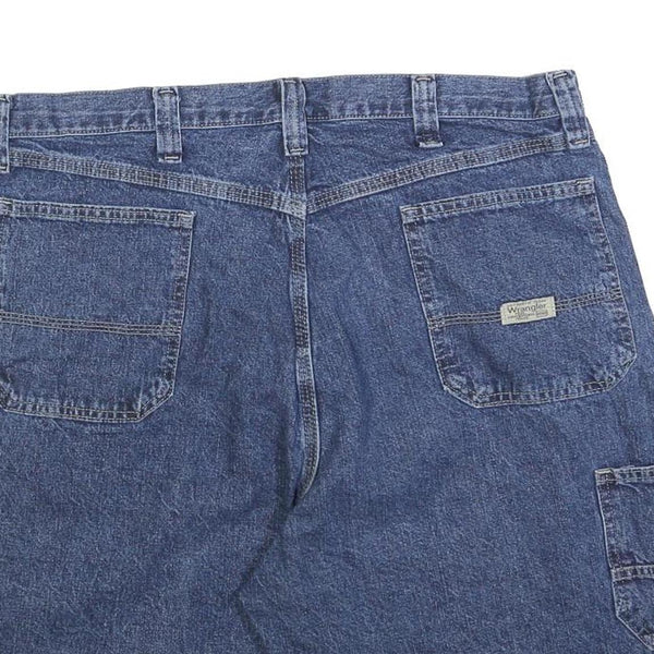 These Wrangler mens shorts are a classic denim blue, crafted from a sturdy cotton blend fabric offering durable comfort. They feature a casual style with multiple pockets including traditional front and back pockets, and additional utility pockets on the side. The sturdy denim fabric provides a relaxed, comfortable fit ideal for everyday wear.
