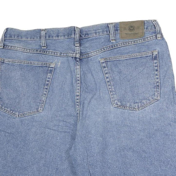 These Wrangler Mens shorts are made from classic blue denim cotton fabric, offering a timeless casual style. They feature a traditional five-pocket design including visible front and back pockets, with belt loops and a zip and button closure at the waist. The cut is relaxed and roomy, suitable for comfortable everyday wear, and they have a mid-length fit just above the knee.