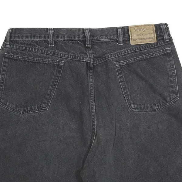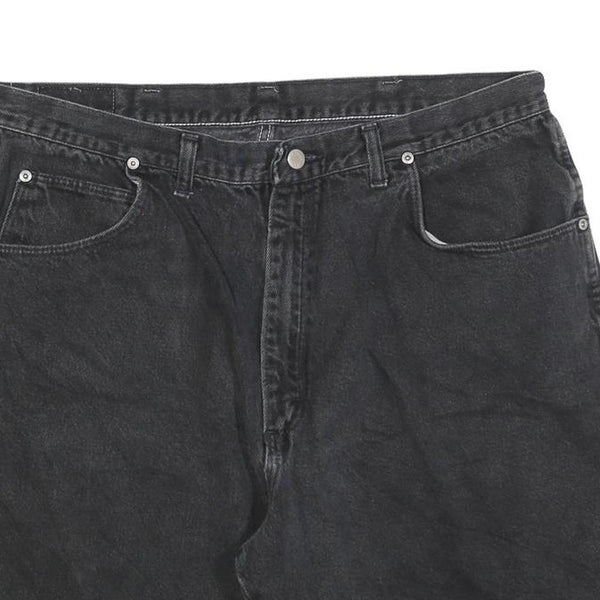 These Wrangler Mens Shorts present a classic black denim finish with a traditional five-pocket layout. They feature a button closure and belt loops, with a leather brand patch on the back waistband. The shorts showcase a plain washed pattern and a timeless casual style.