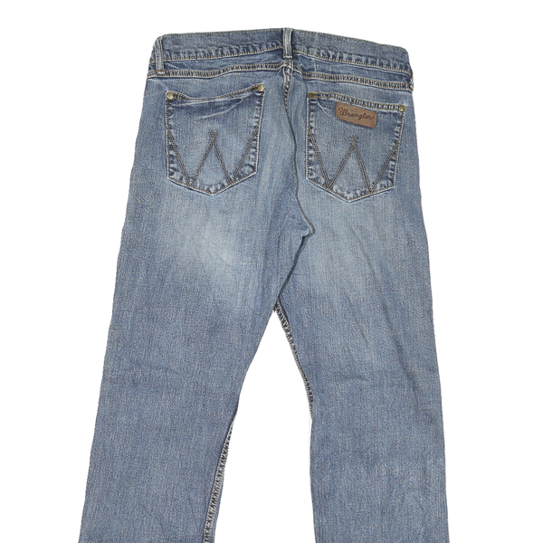 These Wrangler mens jeans feature a classic medium blue denim with a faded, worn-in wash for a vintage look. The fabric has a cotton blend composition offering slight stretch for comfort and durability. The front displays subtle whiskering and fading around the thighs and knees for authentic style.