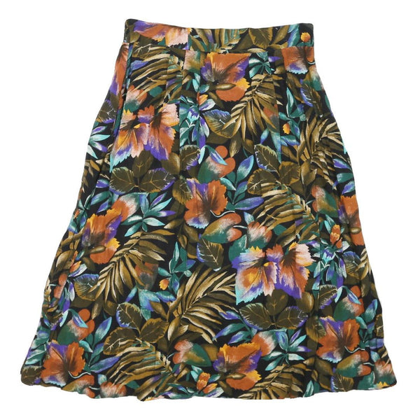 This YASMIN womens skirt features a vibrant multicolour floral and leafy print on a rich olive background, creating a bold yet elegant statement piece. The skirt showcases large flowers in orange, purple, teal and brown hues, complemented by detailed tropical-style leaves all over the fabric.